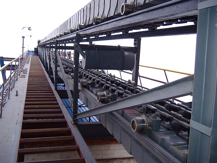 SCD Clinker pan (bucket) conveyor is mainly used for conveying clinker. It has two types, pan conveyor and bucket conveyor. SCD conveyor can be used in extreme environment. It is allowable for conveying materials with instant temperature as high as 500℃. The incline angle is able to reach 60°. The max conveying capacity is 750m3/h and the max height is 60m.